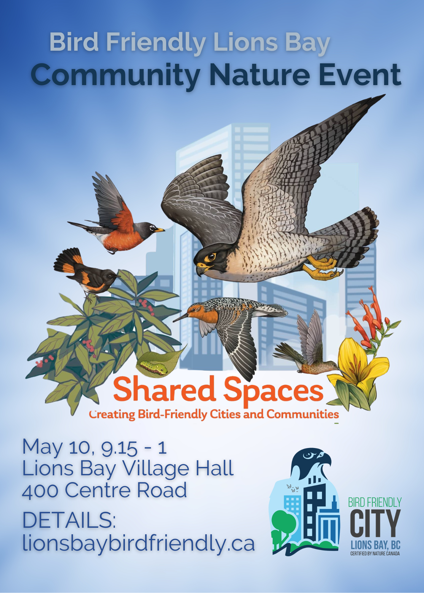 Lions Bay is an officially certified Bird Friendly City. Come and learn what this means and how you can be Bird Friendly at home and in your community, including creating native, biodiverse gardens. We’ll highlight the many threats to birds and the importance of creating and protecting the habitat they desperately need. Visit the information tables, complete the entry form and enter to win a prize. Entry is free, donations welcome. Other activities: Sessions specially for kids (sign-up required for some) Short hike to see the Bald Eagles’ nest (and possibly eaglets) Announcement of the vote for Lions Bay’s Official Village Bird Tea, Bird Friendly coffee, treats, BBQ hot dogs Participating partners: Lions Bay Native Plant Garden and Butterflyway Project Lions Bay Climate Action Committee Átl’ka7tsem/Howe Sound Marine Stewardship Initiative Stewardship Center for BC – Cats and Birds Program Nature Squamish – Wildlife Connectivity Project Lions Bay Bear Smart Lions Bay Trailblazers Hiking Group Detailed information on our website www.lionsbaybirdfriendly.ca.